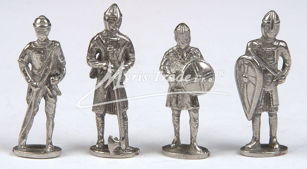 sada 4 kusů miniaturních normanských a saských vojáčků provedených z kovu stříbrné barvy, balených v igelitovém sáčku s papírovou lištou s popisky