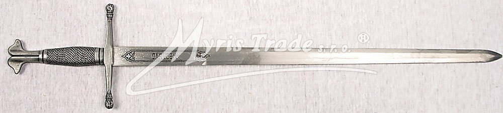 ozdobný malý mečík vyrobený z kovu šedé barvy