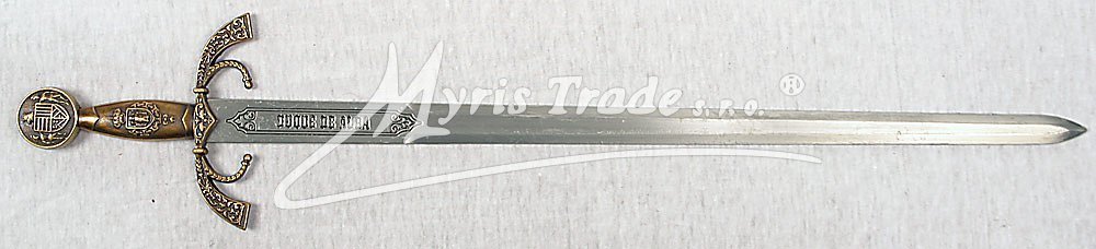 ozdobný malý mečík vyrobený z kovu v šedé a bronzové barvě