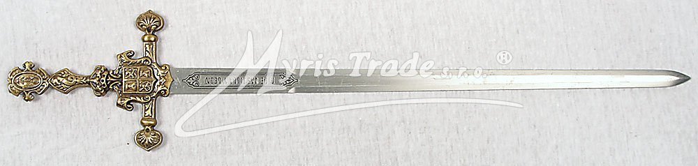 ozdobný malý mečík vyrobený z kovu v šedé a bronzové barvě