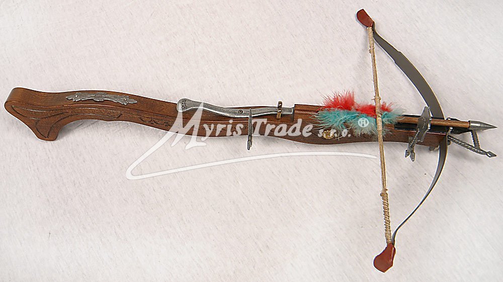 nefunkční replika historické kuše s horním spouštěcím mechanizmem vyrobená ze dřeva a šedého kovu s dřevěnou šipkou