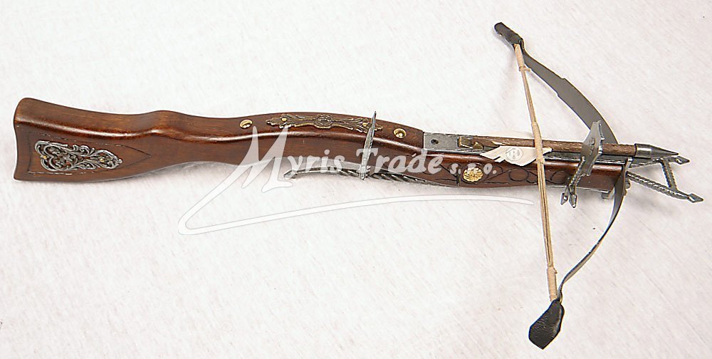 nefunkční replika historické kuše s dolním spouštěcím mechanizmem vyrobená ze dřeva a šedého a bronzového kovu s dřevěnou šipkou