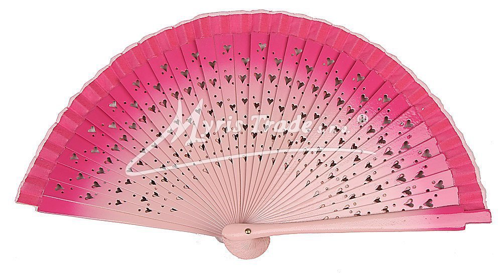 dřevěný vějíř v menší velikosti, s vyřezávanými srdíčky , barevně lakovaný, s užší textilní obrubou.