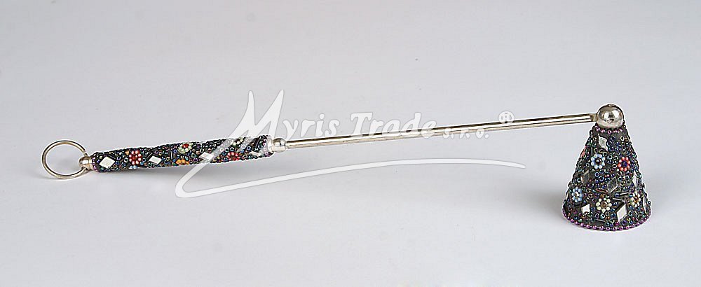 zhasínátko je vyrobeno se stříbrného kovu, hlava zhasínátka a rukojeť jsou zdobené drobnými barevnými korálky a sklíčky délka: 30 cm