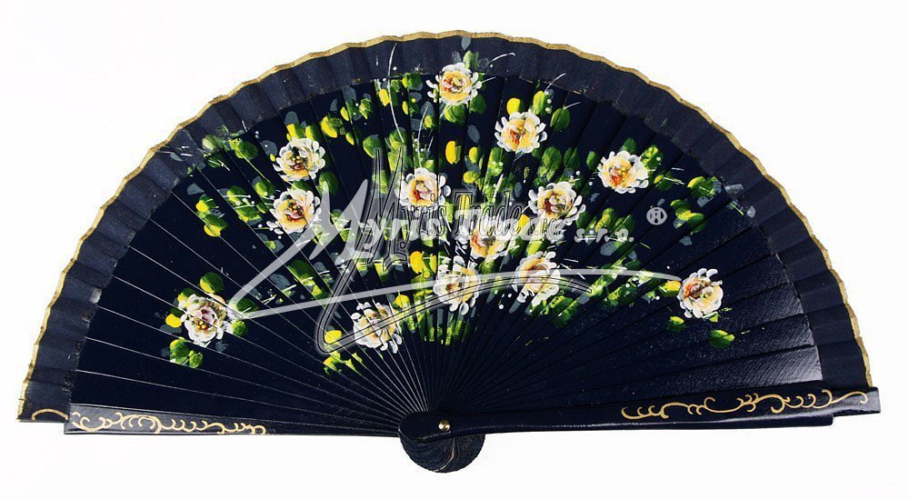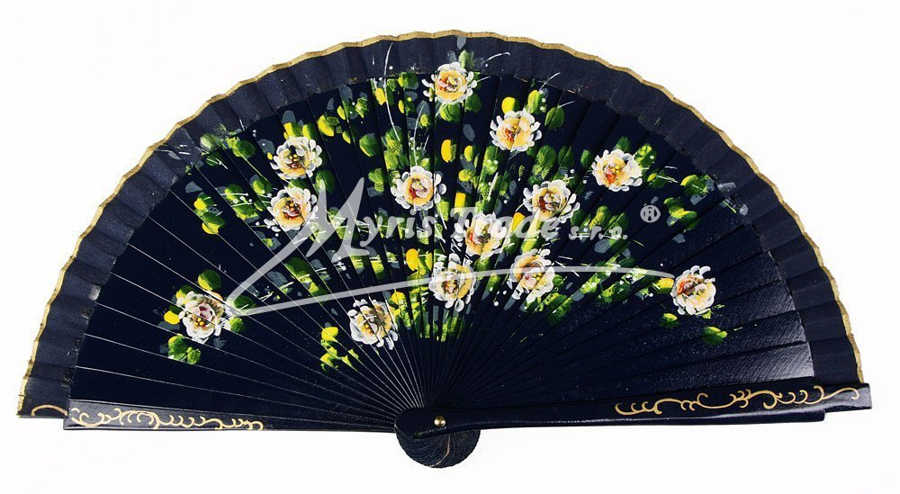 vějíř z lakovaného, hladkého dřeva a textilu, bohatě ručně malovaný stejným motivem na obou stranách