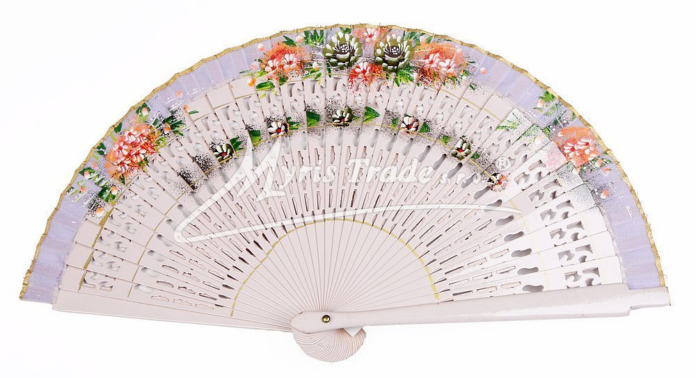 vějíř z lakovaného, vyřezávaného dřeva a textilu, bohatě ručně malovaný stejným motivem na obou stranách
