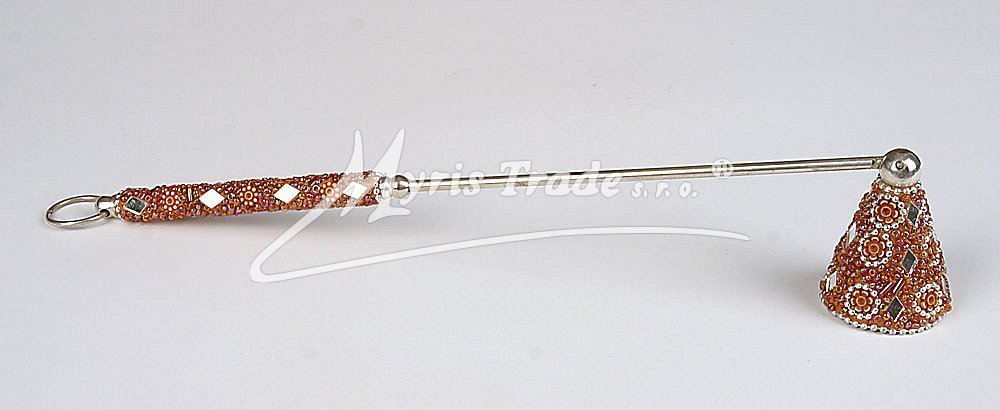 zhasínátko je vyrobeno se stříbrného kovu, hlava zhasínátka a rukojeť jsou zdobené drobnými barevnými korálky a sklíčky délka: 30 cm