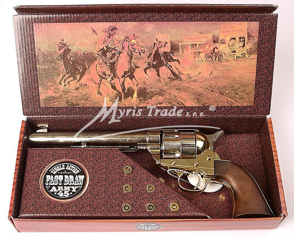 balení: stylově potištěná krabice s 6ti replikami nábojů váha repliky kopíruje váhu pravé zbraně, mechanizmus otáčení bubínku je funkční