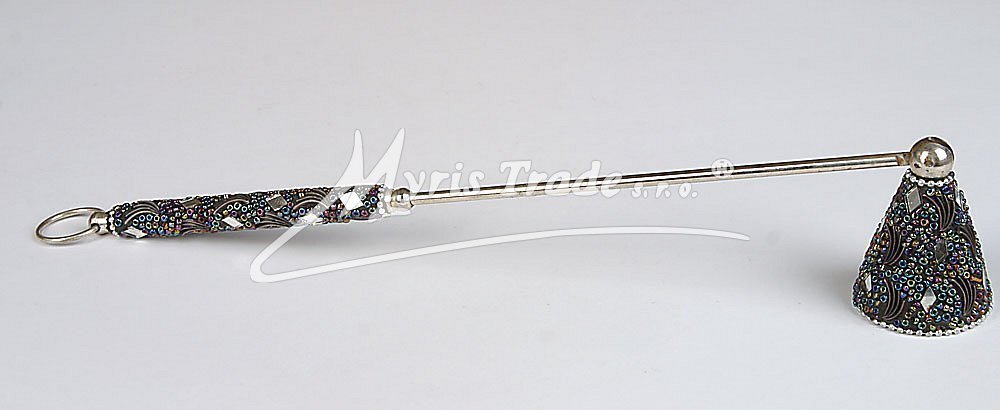 zhasínátko je vyrobeno se stříbrného kovu, hlava zhasínátka a rukojeť jsou zdobené drobnými barevnými korálky a sklíčky délka: 30 cm