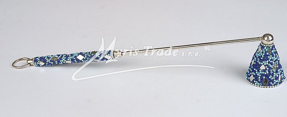zhasínátko je vyrobeno se stříbrného kovu, hlava zhasínátka a rukojeť jsou zdobené drobnými barevnými korálky a sklíčky délka: 30 cm