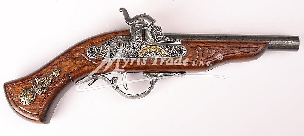 nefunkční replika historické křesadlové pistole ze dřeva, šedého kovu a bronzu