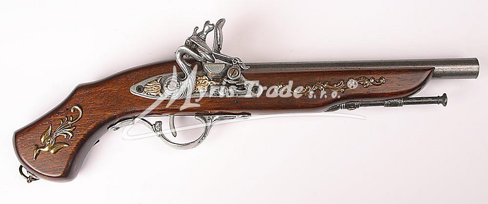 nefunkční replika historické křesadlové pistole ze dřeva, šedého kovu a bronzu