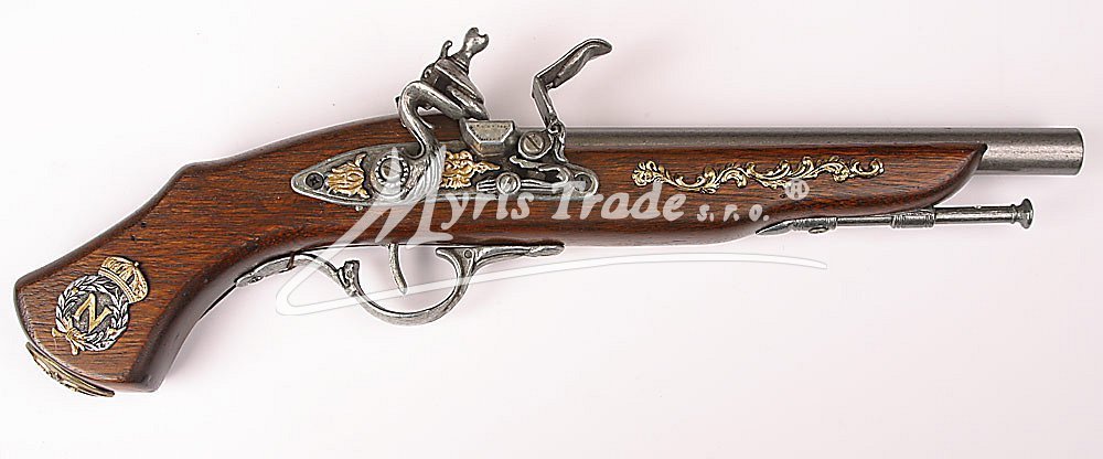 nefunkční replika historické křesadlové pistole ze dřeva, šedého kovu a bronzu