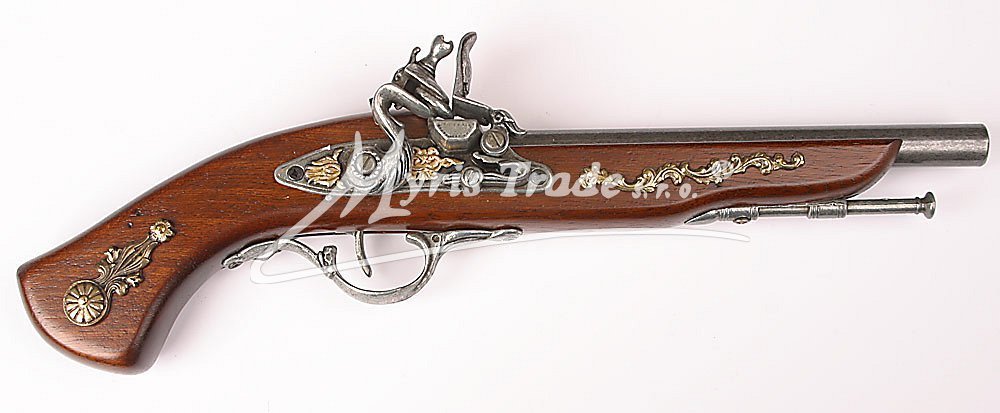 nefunkční replika historické křesadlové pistole ze dřeva, šedého kovu a bronzu