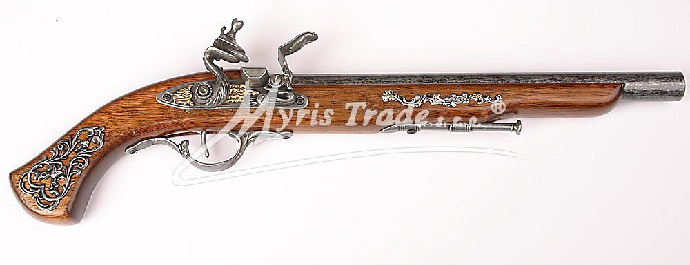 nefunkční replika historické křesadlové pistole ze dřeva, šedého kovu a bronzu
