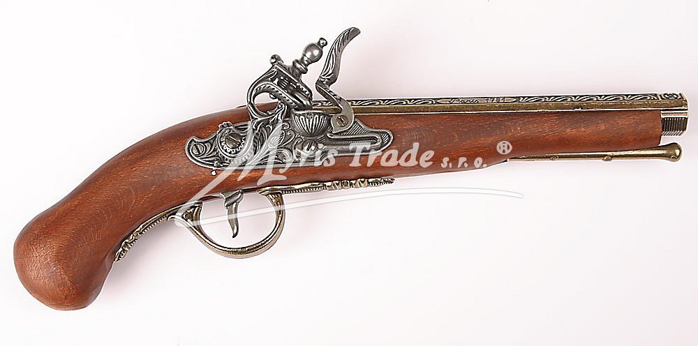 nefunkční replika historické křesadlové pistole ze dřeva, šedého kovu a bronzu