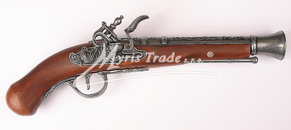 nefunkční replika historické křesadlové pistole ze dřeva a šedého kovu