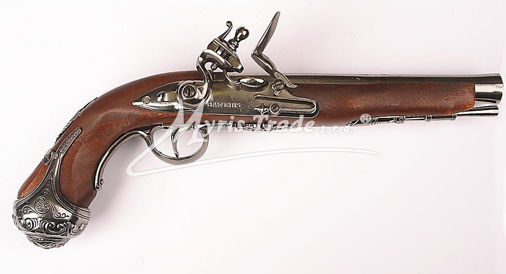 nefunkční replika historické křesadlové pistole ze dřeva a šedého kovu