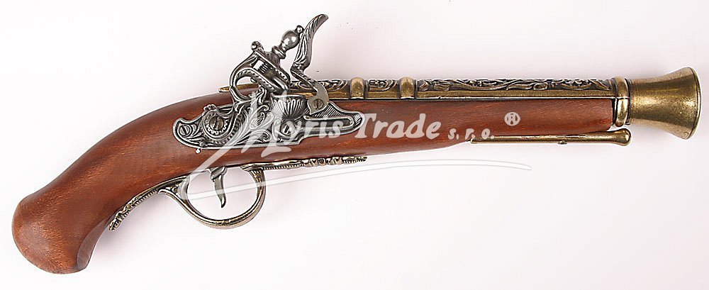 nefunkční replika historické křesadlové pistole ze dřeva, šedého kovu a bronzového kovu