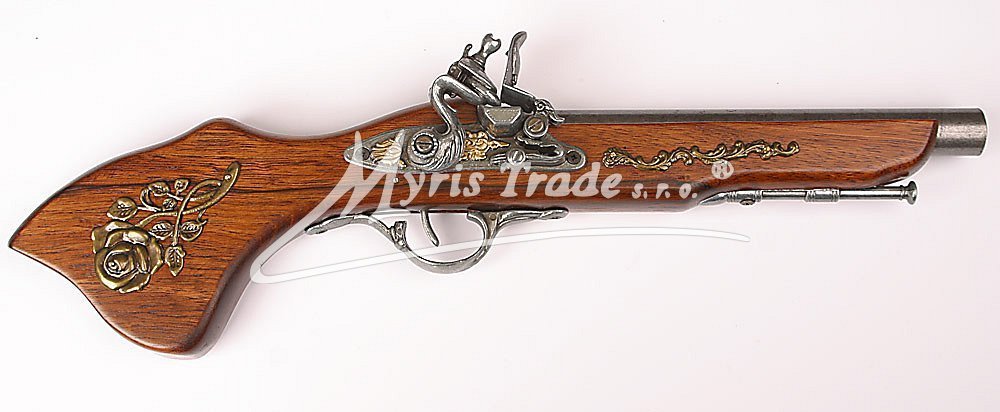 nefunkční replika historické křesadlové pistole ze dřeva, šedého kovu a bronzu