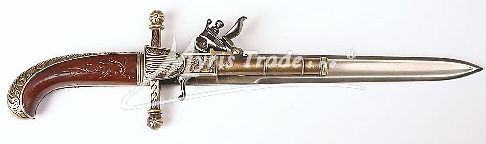 nefunkční replika historické atypické pistole kombinované s dýkou z dokonalé imitace dřeva a kovu v barvě bronzu