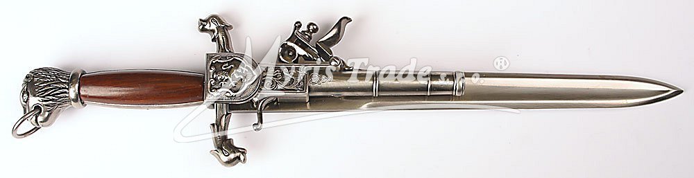 nefunkční replika historické atypické pistole kombinované s dýkou z dokonalé imitace dřeva a šedého kovu