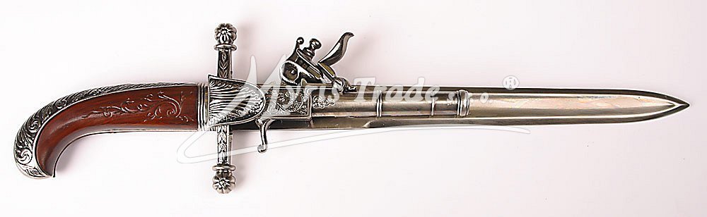 nefunkční replika historické atypické pistole kombinované s dýkou z dokonalé imitace dřeva a kovu v barvě bronzu