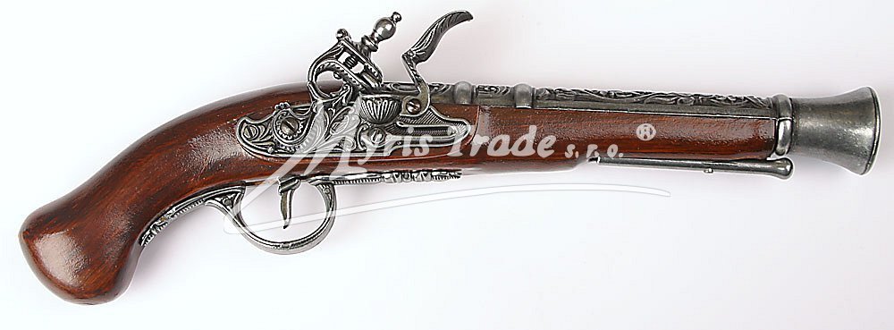 luxusně provedená nefunkční replika historické křesadlové pistole - trombónu z dokonalé imitace dřeva a šedého kovu