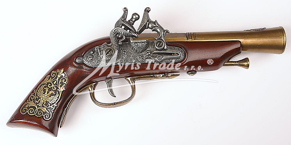 luxusně provedená nefunkční replika historické křesadlové pistole z dokonalé imitace dřeva a kovu barvy bronzu
