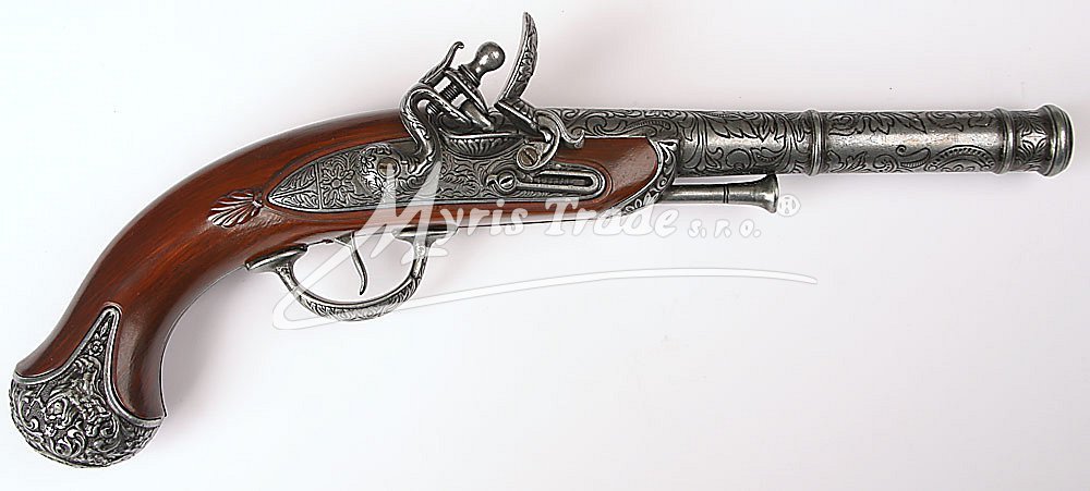luxusně provedená nefunkční replika historické křesadlové pistole z dokonalé imitace dřeva a šedého kovu