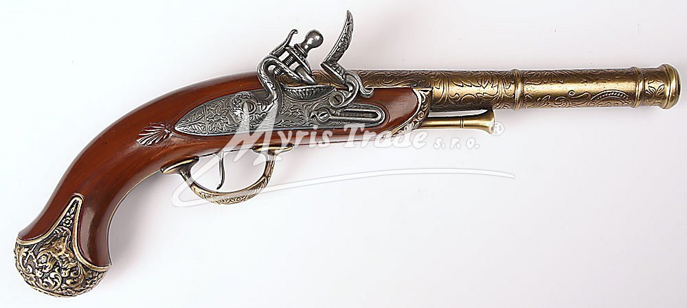 luxusně provedená nefunkční replika historické křesadlové pistole z dokonalé imitace dřeva a kovu barvy bronzu