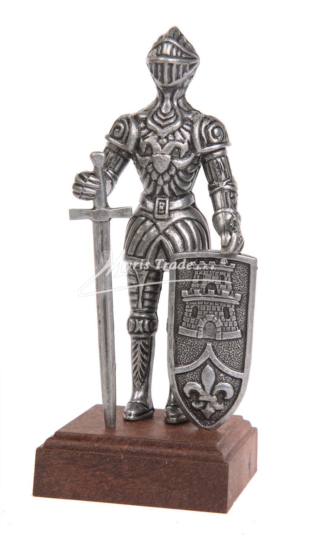 soška rytíře v brnění provedená z šedého kovu, na dřevěném podstavci, s mečem a štítem