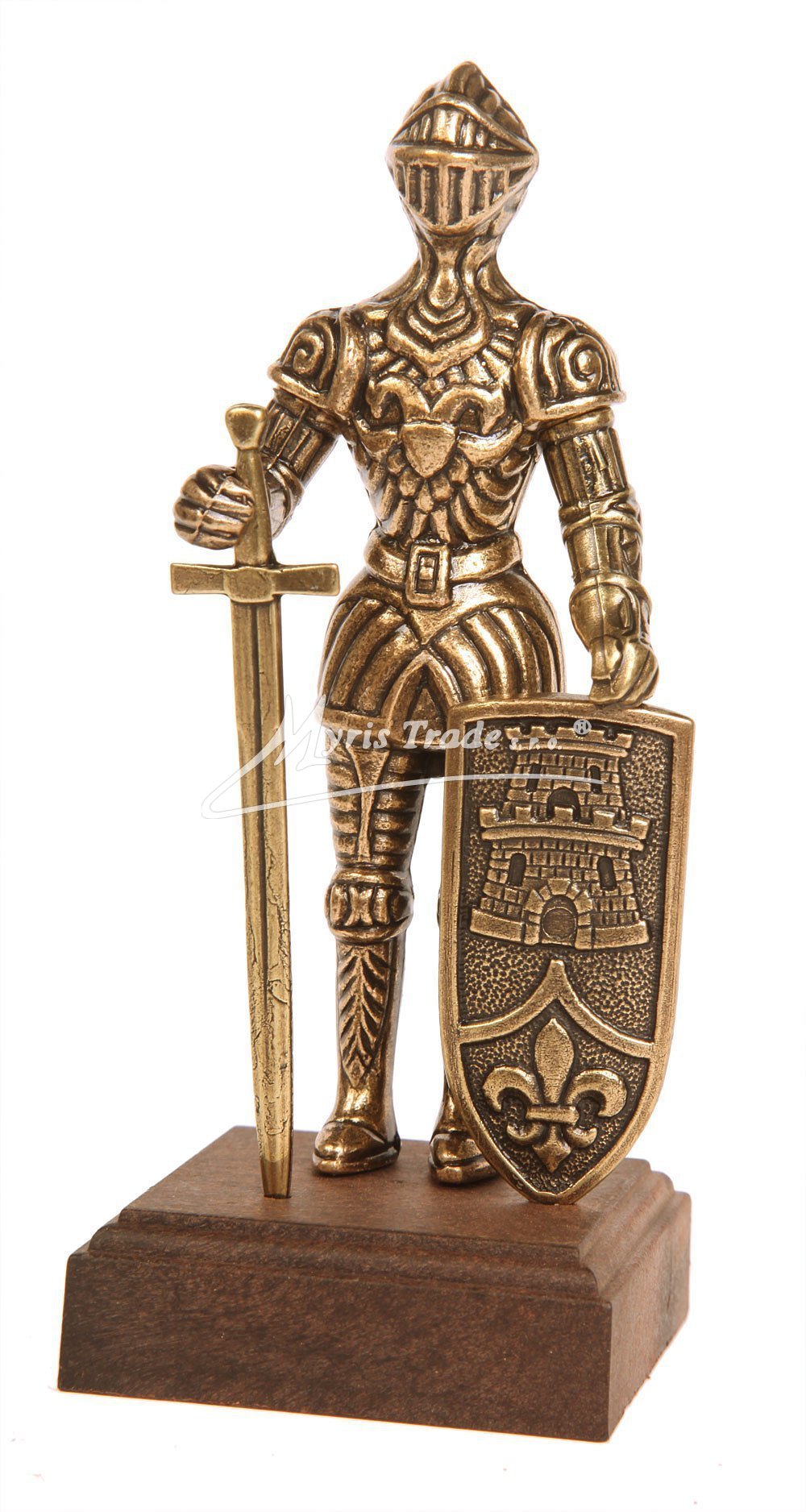 soška rytíře v brnění provedená z kovu barvy bronzu, na dřevěném podstavci, s kopím a štítem