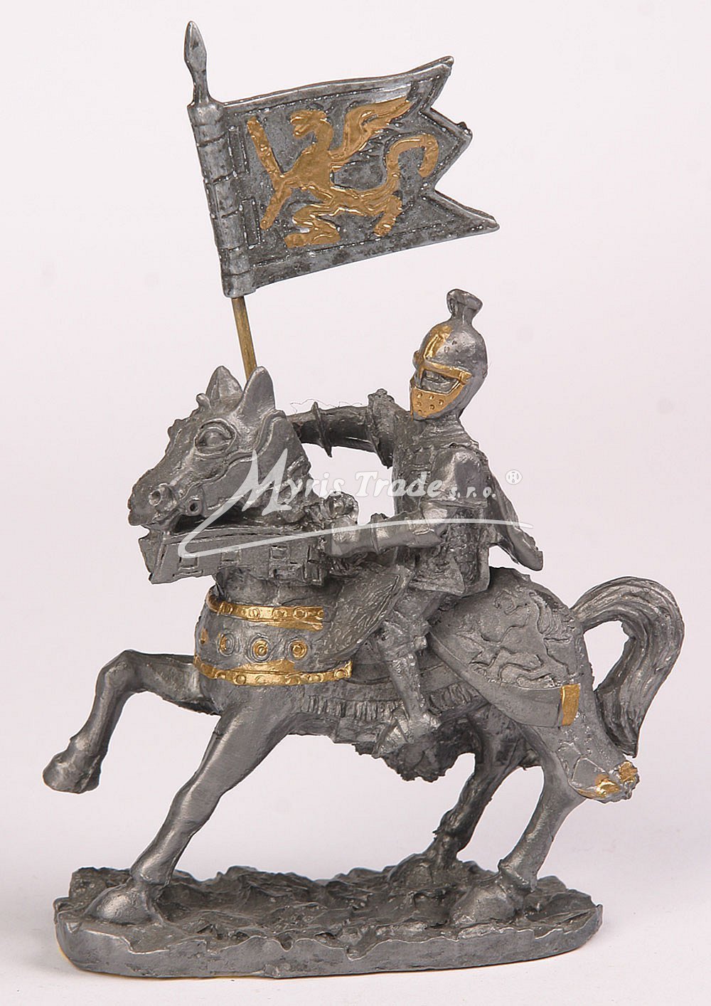 soška rytíře na koni provedená z šedého kovu a bronzu, s praporem