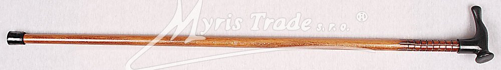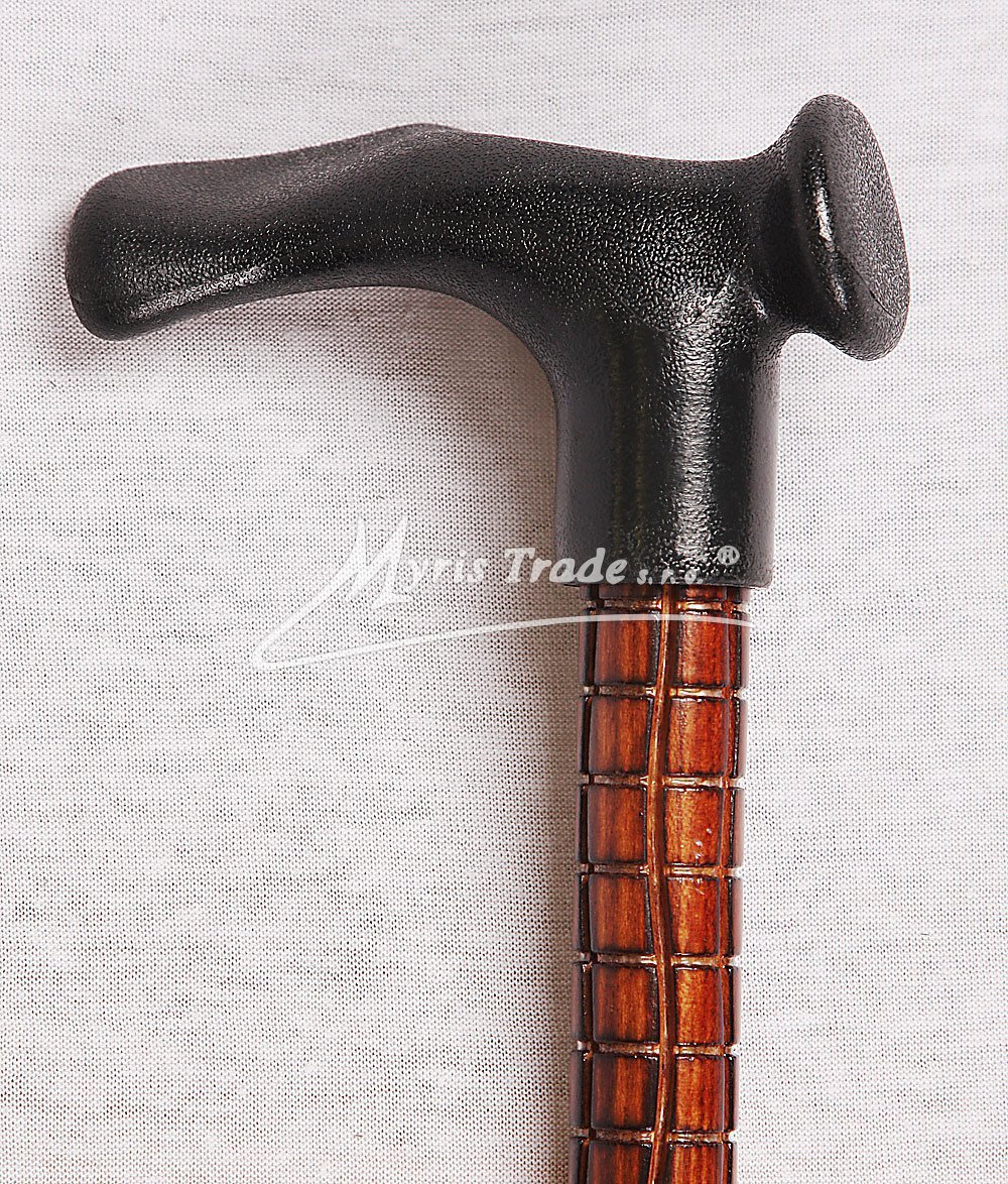 plně funkční vycházková hůl z masivního tmavě hnědého dřeva a černou ergonomickou rukojetí, umožňující dokonalé opření ruky