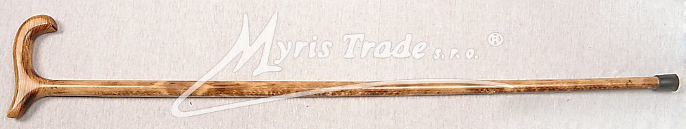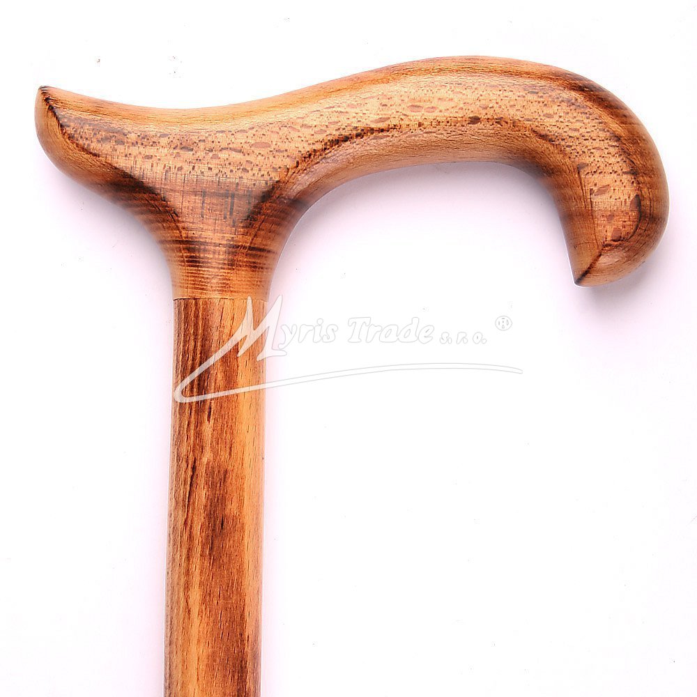 plně funkční vycházková hůl z masivního, scětle hnědého, žíhaného dřeva s rovnou rukojetí, umožňující pevné opření ruky