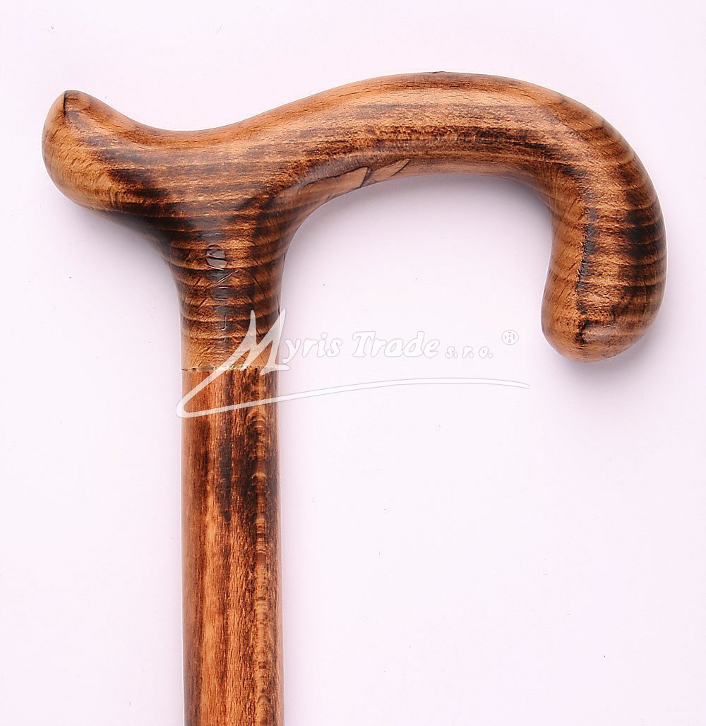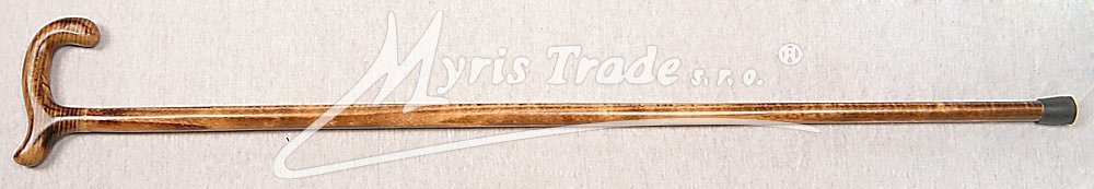 plně funkční vycházková hůl z masivního, světle hnědého, žíhaného dřeva s rovnou rukojetí, umožňující pevné opření ruky